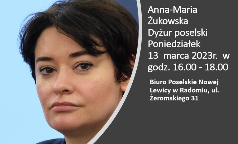 Informacja: Dyżur poselski Posłanki na Sejm RP IX kadencji Anny Marii Żukowskiej w dniu 13 marca 2023r.